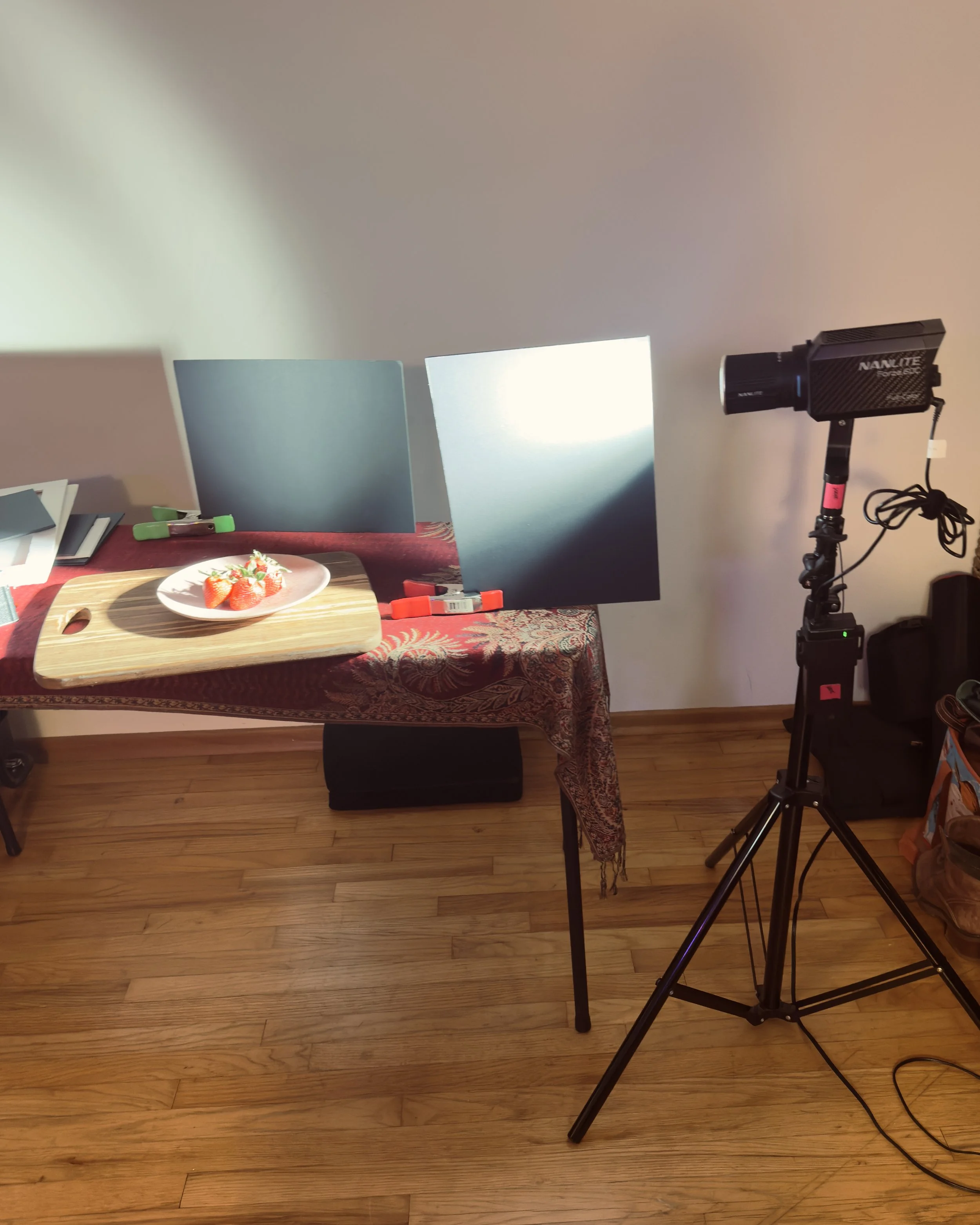 The softbox provides, this lovely, soft light (hence the name!). For a few photos I used just the softbox and then I added a bounce card to fill in the strawberries a little.