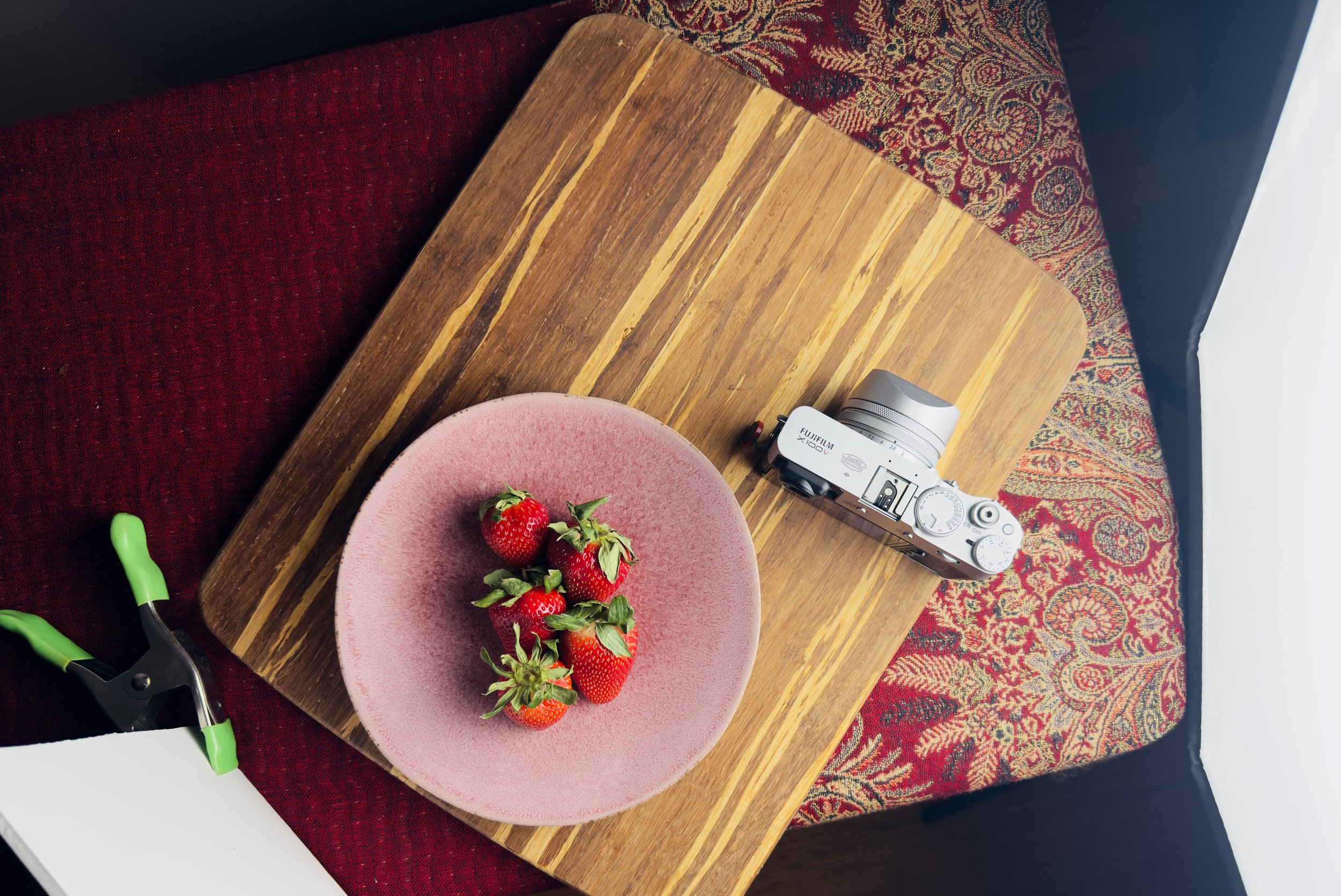 A few days ago I picked up some strawberries and thought they’d make a lovely subject to show off the flexibility of using one light, and a couple of simple elements to highlight.